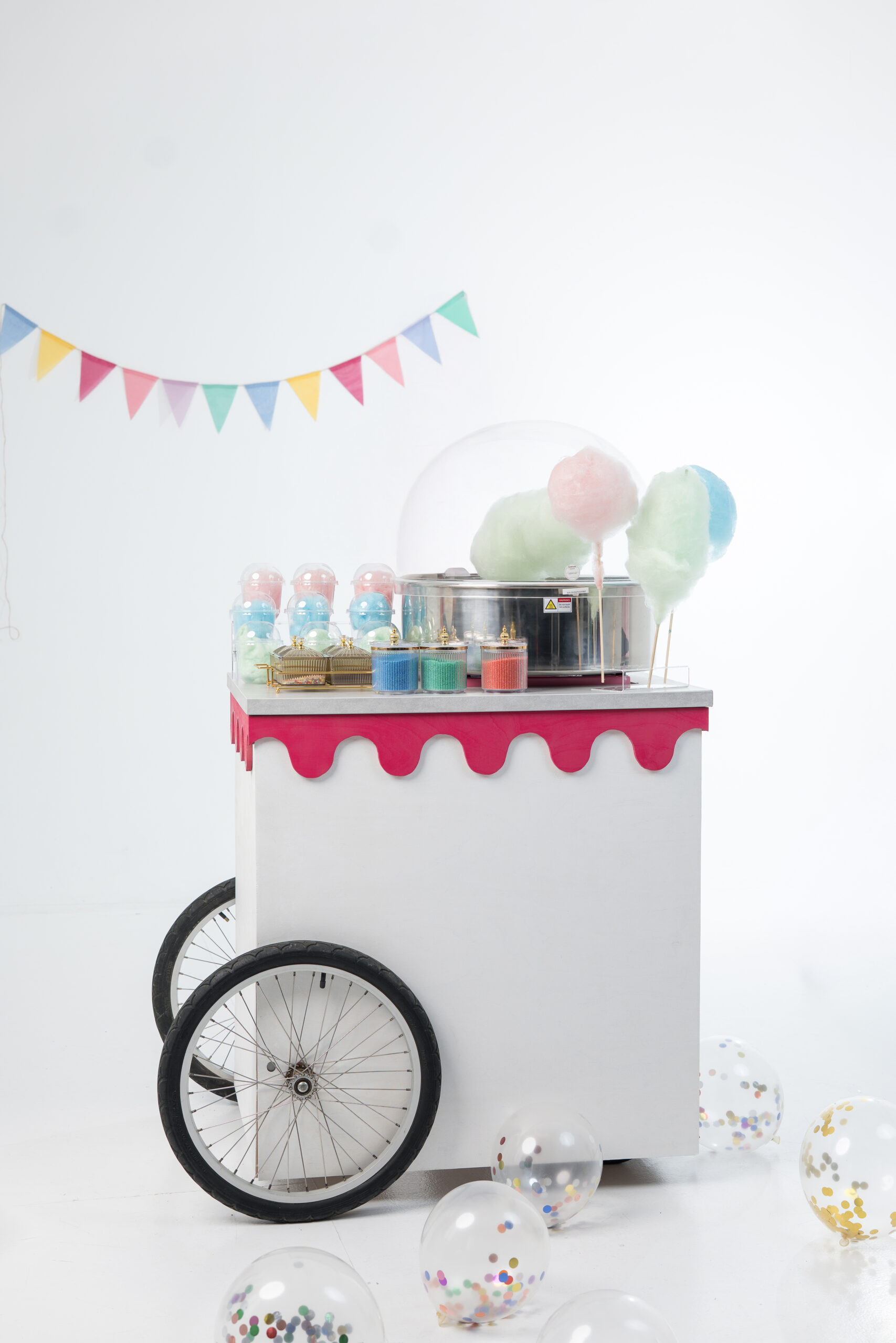 Ar galima rinktis cukrauTaip! Turime įvairių spalvų (rožinė, mėlyna, žalia) ir net skonių (obuolys, braškė, arbūzo). Galima derinti prie šventės temos, cukraus vatos spalvas ar skonius.